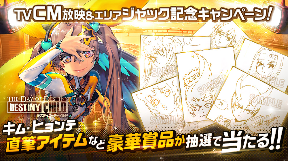 TVCM放映&エリアジャックを記念し、『デスティニーチャイルド』のディレクター兼キャラクターデザインを務めるキム・ヒョンテの「直筆イラスト&サイン色紙」や「直筆サイン入りアートブック」などの激レア賞品が抽選で合計141名様に当たるプレゼントキャンペーンを開催!