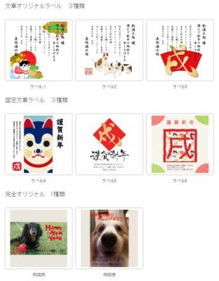 年賀状を模したラベルは、新年の干支である「戌(いぬ)」の年賀状のデザインで、一部ラベルにおいてはオリジナルで新年のご挨拶の文章やお名前をご指定頂けるセミオーダーシステムを採用しており、本年はさらにお客様のご自身でデザインされたラベルに対応いたします。