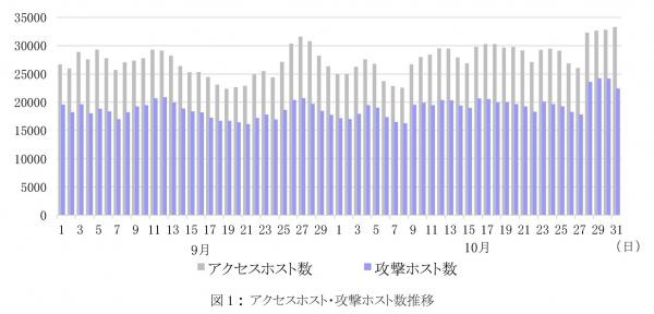 図1に示す通り、10月期もIoT機器への攻撃が継続的に行われています。当観測システムでは、10月は1日当たり約2.8万IPアドレスからのアクセス(アクセスホスト数)、約1.9万IPアドレスからの不正な侵入(攻撃ホスト数)を観測しています。9月と比較して、10月の総アクセスホスト数は5%増加、総攻撃ホスト数は6%増加で微増という結果ですが、グラフを見ると10月28日から数値が急上昇していることがわかります。
