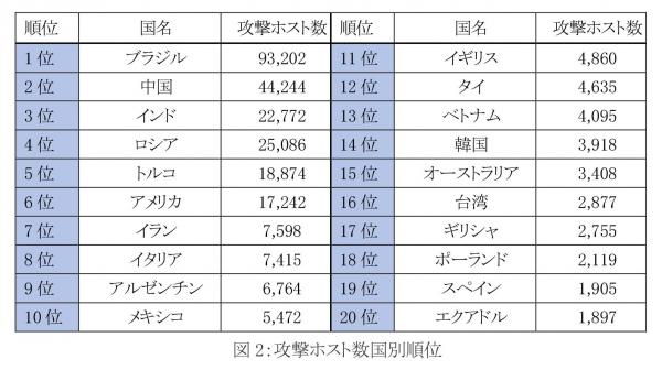 ※注:上記は単純な攻撃ホスト数のカウントであり正規化を行なっていないため、人口やインターネット利用者数が多い国が上位にきている点に注意が必要です。