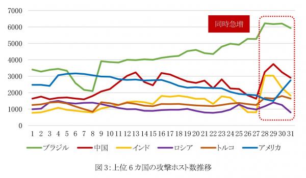 変化の見られた10月28日以降の各国の攻撃数の推移を分析したところ、図3のように上位6カ国で攻撃数が同時に増加するなどの変化が見られました。この状況については11月も引き続き観測を継続する予定です。