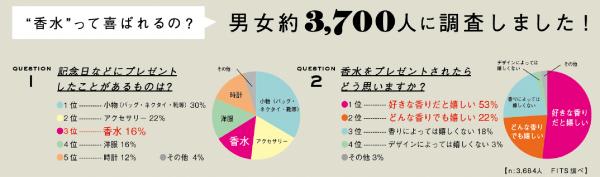 実は隠れた人気ギフト、香水。フィッツコーポレーションが行った調査では、実際にプレゼントしたことがあるものとして、定番の小物やアクセサリーに次ぐ3位にランクイン。また、「プレゼントされたらどう思うか」という質問では、5人に1人が「どんな香りでも嬉しい」と答えるなど、香水をプレゼントされること自体が嬉しいという人がいるのがわかります。「相手が自分に似合うと思って選んでくれたのが嬉しい」「相手の好きな香りをくれたという気持ちが嬉しい」という声があがりました。