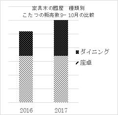 飛騨地区の冬と言えばこたつを使う家庭が多く、特に9-12月が一番の商戦期になります。ここ数年、少しずつ椅子に座るタイプのダイニングこたつの販売量が増えていたのですが、今年の9-10月は昨年比+50%、定番の座卓タイプとほぼ同じ数量売れました。座卓タイプのこたつの販売数量は昨年と変化ありませんでした。