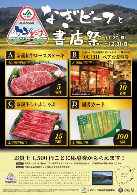 今回、JA勝英内の「なぎビーフ銘柄推進協議会」からご協賛をいただき、「なぎビーフ」のステーキやしゃぶしゃぶ肉が当たる抽選プレゼント企画を開催します。今回の取り組みにより、「なぎビーフ」の知名度拡大と参加書店の売上向上を図ります。