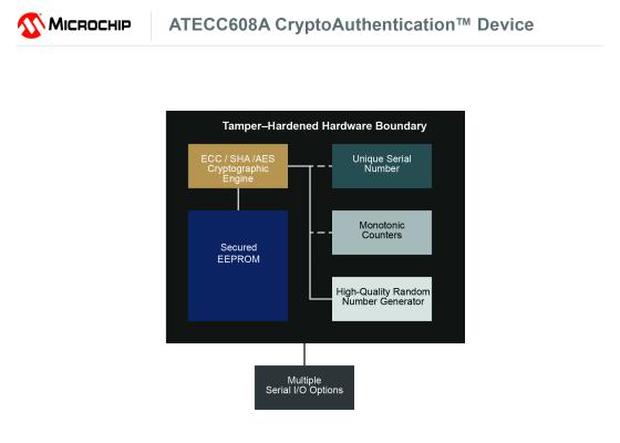 通信セキュリティの基盤は、デバイス固有の信頼済みアイデンティティを作成、保護、認証する機能で構成されます。デバイスの秘密鍵をシステムから隔離されたセキュアな領域に格納でき、業界最先端の暗号手法を採用したATECC608Aは、ほぼ全種の設計に使える高度なセキュリティを提供します。ATECC608Aの主な機能は次の通りです。