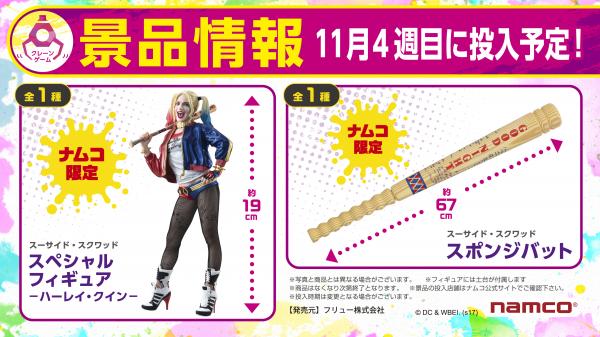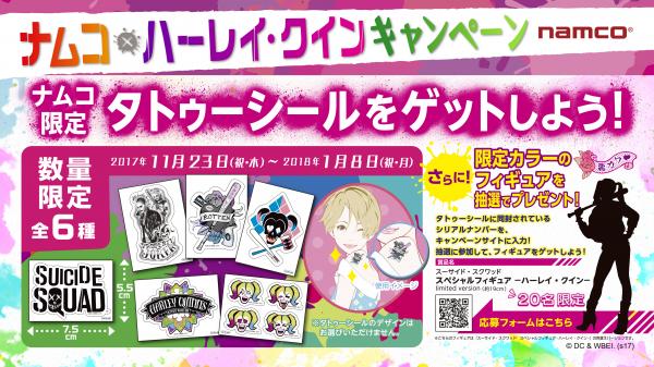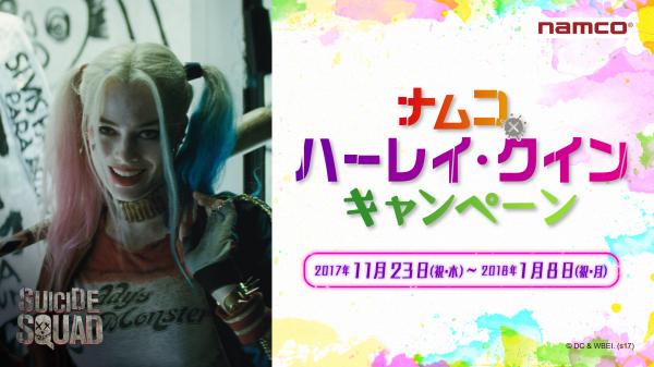 株式会社ナムコ(本社:東京都港区)は、フリュー株式会社とタッグを組んで、DCのダークヒロイン、ハーレイ・クインをナムコ限定景品としてフィギュア化しました。それを記念して2017年11月23日(木・祝)~2018年1月8 日(月・祝) の期間「ナムコ×ハーレイ・クイン キャンペーン」を、ナムコ直営アミューズメント施設約100店舗で実施いたします。