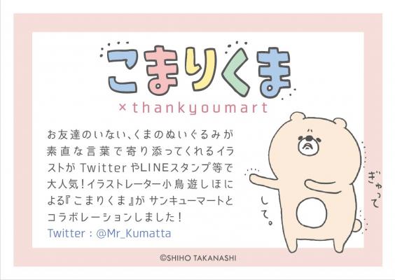 エルソニック株式会社が運営するサンキューマートは、国内外を問わず人気の高いキャラクターや新進気鋭のクリエーターをはじめ製菓メーカー、映画、アニメなどとのコラボレーション商品を企画しております。2017年11月18日より、「こまりくま」と「サンキューマート」のコラボ商品を販売いたしております。