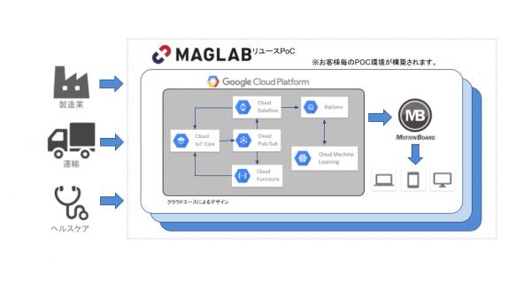 クラウドエース株式会社 (本社:東京都千代田区、代表:吉積 礼敏、以下「クラウドエース」) と 株式会社MAGLAB(本社:高知県高知市帯屋町、代表:武市 真拓、以下「MAGLAB」)は、本日2017年11月22日よりパブリッククラウドにおけるIoTのPoC(Proof of Concept、概念実証実験 )の成功率を向上するためのアライアンス強化を行い、同日サービスの提供を開始いたします。これは、 実施済みの実証実験をモデル化して組み合わせるMAGLABの「リユースPoC」とクラウドエースの「IoT Ace」を組み合わせるもので、Google Cloud Platform 上でのIoTやAI技術を使ったPoCやその後の運用を効率よく提供することが可能となります。