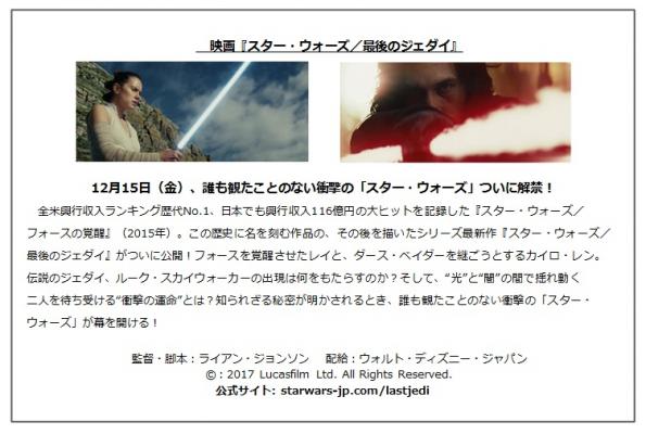 12月15日公開 映画『スター・ウォーズ/最後のジェダイ』連動企画を実施
