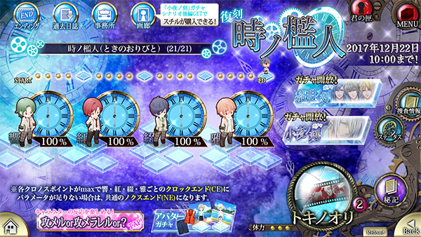 イベントシナリオでクロックエンド(どのキャラでもOK)を1人分迎えると『黎明ノ刻ガチャ』が開放され、
