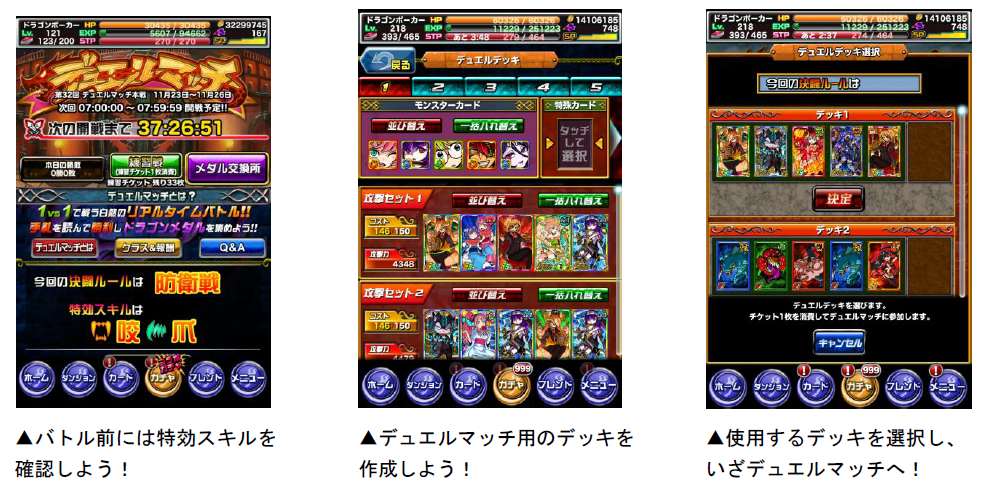 デュエルマッチでは、通常よりも高い効果を発揮する「特効スキル」が設定されています。今回の「デュエルマッチ」の特効スキルは、咬・爪です。特効スキルのカードをデッキに入れて、有利にバトルを勝ち進めましょう。