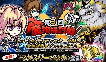 2017年11月21日(火)からクエストカウンター内のボスモンスター討伐数に応じて豪華アイテムが貰える「第3回魔物掃討戦」イベントを開催いたしました。イベント期間中のみクリアできる限定ミッションの追加や、期間中に倒したボスの種類に応じて様々な冒険に役立つ報酬を獲得することができます。
