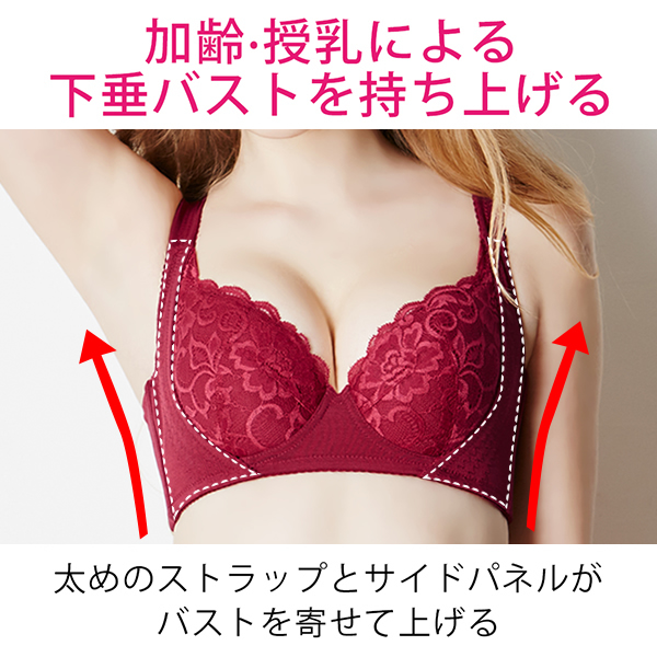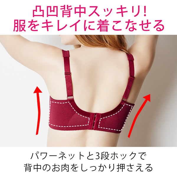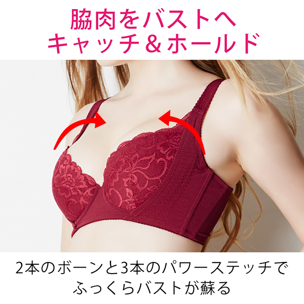 ブラジャーの食い込みより、バストの脇や背中からはみ出てしまう「脇肉」は、ボディラインをデコボコとさせ、老けた印象に見られてしまいます。当商品は、脇からはみ出るお肉をおさえてすっきりと見せる「脇高設計」と、バストから流れる脇のお肉を食い止める2本のボーンなど、こだわりの機能で痩せ見えを叶える補整ブラジャーです。はみ出たお肉をバストに戻す機能に優れているため、出産や授乳、加齢などで下垂してしぼんでしまったバストをふっくらと見せてくれます。2010年の販売以来、シリーズ合わせて累計販売数40万枚を超えるロングセラー商品で、30代から40代を中心とした女性にご好評いただいています。