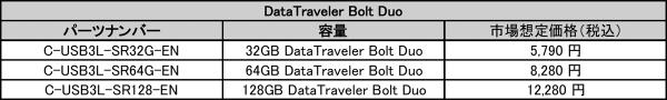 DataTraveler Bolt Duoは、32GB、64GB、および128GBの容量が用意され、2年間の保証、無料テクニカルサポート等、定評あるKingstonの信頼性に裏付けられています。詳細は www.kingstongo.com/bolt をご覧ください。