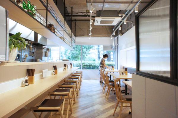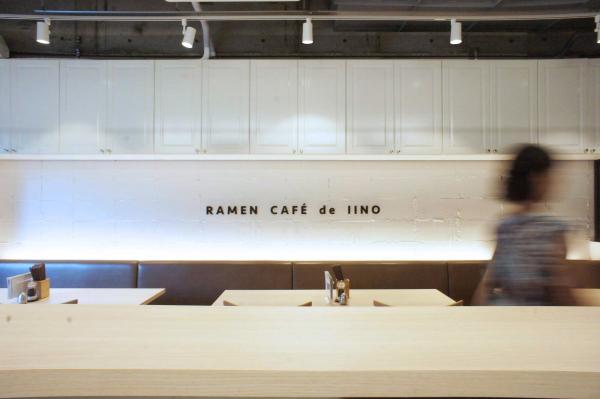 株式会社インクルードデザインが、馬事公苑の豊かな緑を正面に望むラーメン店『RAMEN CAFÉ de IINO』のロゴ、販促物、店舗内装までのブランディングデザインを手掛けました。コンセプトは、女性でも家族でも入りやすいカフェのようなラーメン店。白ブロック × 木目、それぞれの素材の質感を活かして、明るくカジュアルにまとめました。黒スチールのフレームとレトロな波ガラスがアクセントに。ラフさを残すことで、ほっとくつろげる空間をつくります。(2017年11月発表)