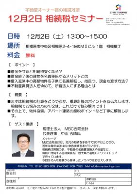 2017年12月2日(土曜日)、不動産オーナー様向けの「相続税セミナー」を開催いたします。
