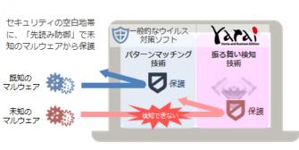 ※3 パターンファイルに全く依存せず、マルウェアの構造や振る舞いを見て、マルウェアに特徴的な「悪意」を分析することにより検知・防御する技術。パターンマッチング技術では防御が難しい新種や改造されたマルウェアであっても、マルウェアに共通する「悪意」を検知して防御することが可能。
