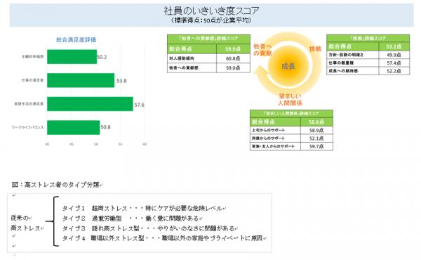 「ストレスをなくすのではなく、ストレスがあってもそれを乗り越えていきいきと働ける強い組織を作ることこそが重要」という弊社のポリシーと心理学的な知見を基に評価を構成しています。働き方改革の一つのテーマでもある、ワークライフバランスをはじめ、社員がいきいきと働く組織の状態を評価することが可能です。また、健康経営に関する評価として社員の不健康に起因した経済的な損失度も評価可能です。