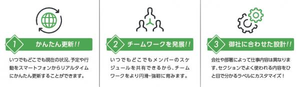 メンバーのスケジュールをリアルタイムで共有することが可能なため、メンバー同士のコミュニケーションツールとしての役割を果たし、チームワークを円滑、かつ強靭に育みます。