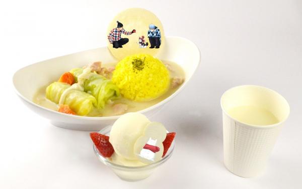 ターメリックライスとロールキャベツが入ったクリームシチューです。ホットバニラオレと雪だるまに見立てた2段重ねのバニラアイスがセットになっています。