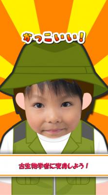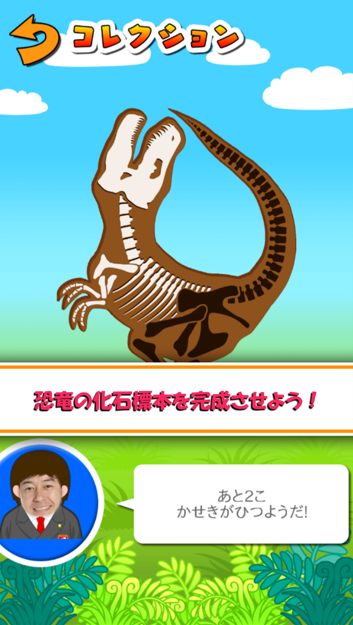 パシャリと撮影!古生物学者の衣装を身にまとい、お父さんやお兄ちゃんは発掘を補助する科学者や博物館の学芸員に変身だ!簡単操作で化石発掘!恐竜の骨格部位を見つけて骨格標本を完成させます。複雑なメニューや説明を省いたシンプルなデザインになっています。一定の条件を満たすとトロフィーや衣装がもらえます。トロフィーを全部集めて伝説の化石ハンターになりましょう。古生物学者に変身したお子さまの勇姿をTwitterやfacebookで投稿できます。本体メニューで言語を変更するだけで、英語・日本語に切り替わり、早期外国語教育にも役立ちます。第三者の広告やアプリ内課金は一切ありません。