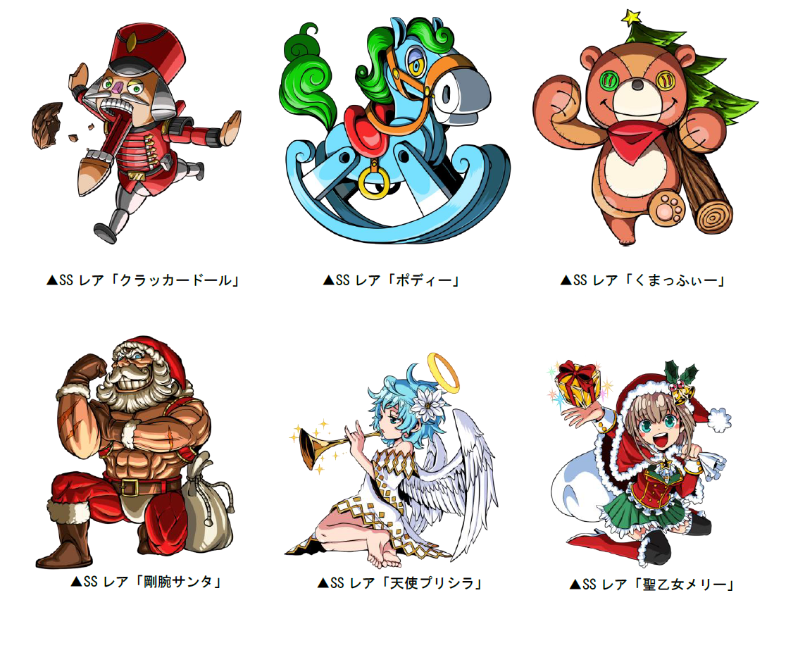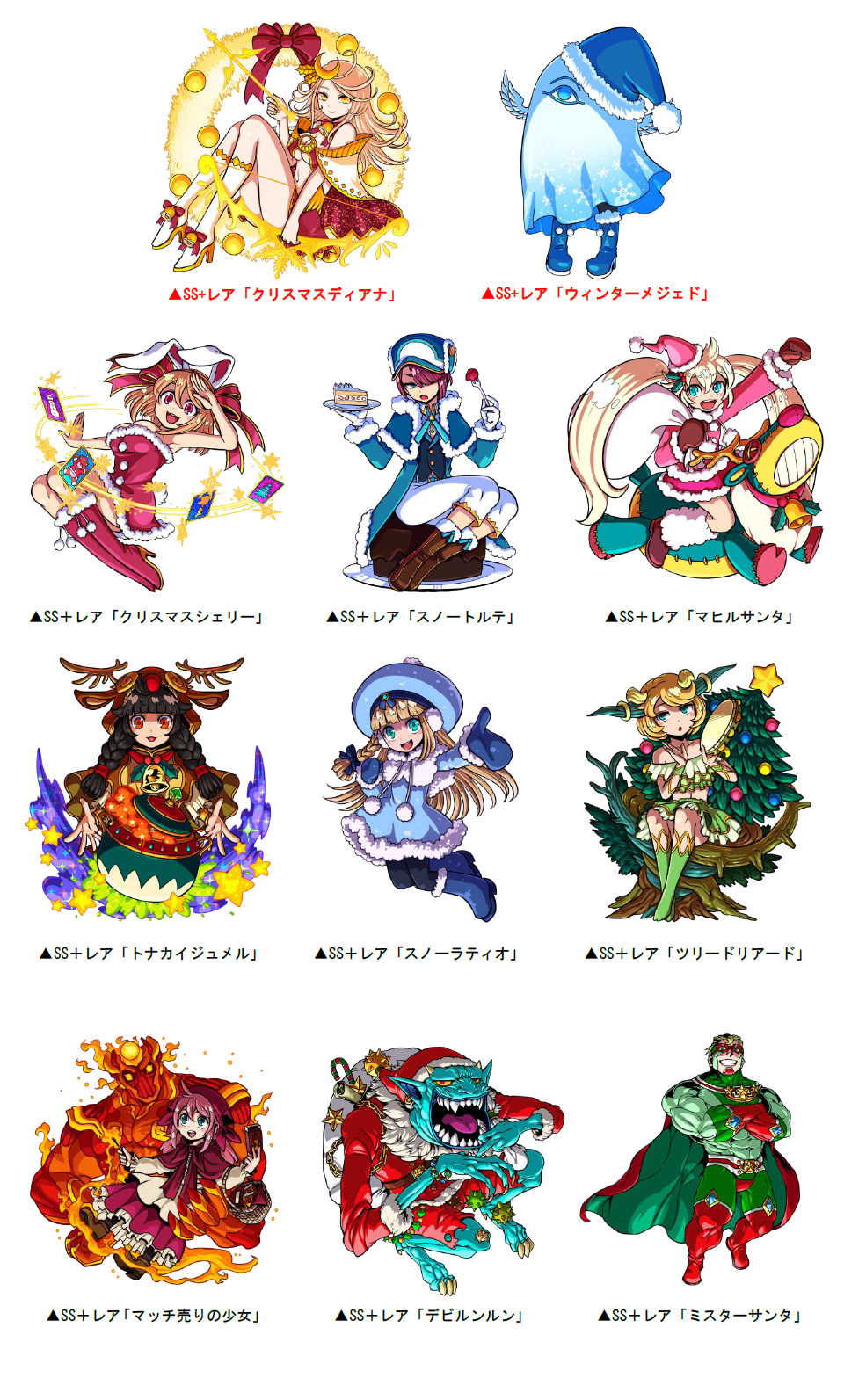 「友達級」以上のボスモンスターとして、SSレア「クラッカードール」「ポディー」「くまっふぃー」「剛腕サンタ」「天使プリシラ」「聖乙女メリー」が出現します。また、「花嫁級」ではSS+レア「クリスマスシェリー」「スノートルテ」「マヒルサンタ」「トナカイジュメル」「スノーラティオ」「ツリードリアード」「マッチ売りの少女」「デビルンルン」「ミスターサンタ」に加えて、新登場の「クリスマスディアナ」「ウィンターメジェド」がボスモンスターとして出現することがあります。