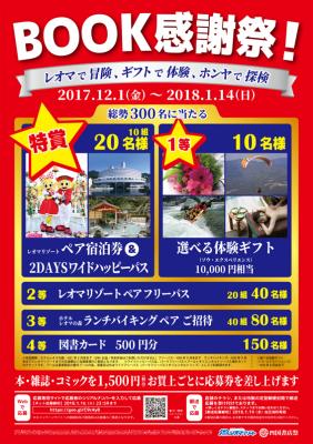 「BOOK感謝祭!」でも、参加する四国4県107の書店にて抽選プレゼント企画を実施します。四国を代表する総合レジャー施設「レオマリゾート」を運営する株式会社レオマユニティー(代表取締役社長:藤岡 勇)とのタイアップによって、レオマリゾートペアフリーパスや同施設内にある「ホテルレオマの森」のペア宿泊券などをご用意したほか、四国エリアで様々なアクティビティが行える体験ギフトと図書カードもプレゼント対象です。