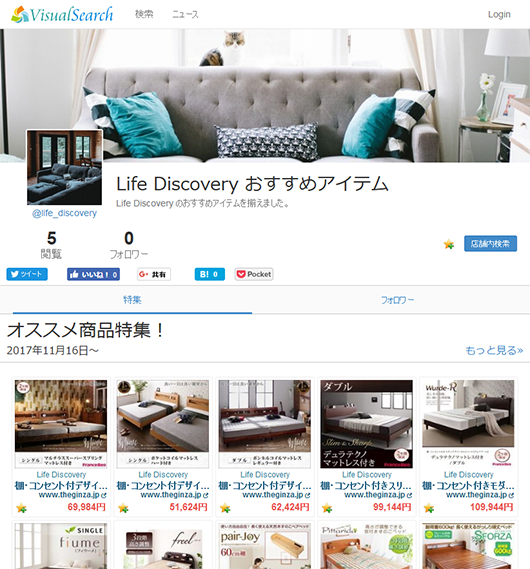 VisualSearch内SNSで、商品の紹介に特化した「店舗公式アカウント」を無料で開設出来ます。
