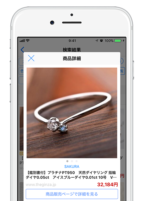 一般的なCPC広告は、広告クリック時に、すぐに課金が発生しますが、 VisualSearchでは、広告クリック時、まず、商品の詳細(高解像度複数画像、商品説明など)を、 オーバーレイ表示(画面上に重ねて表示)します。