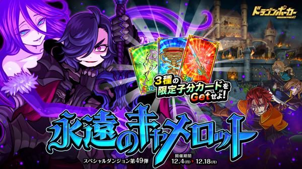12月4日(月)メンテナンス後より、新スペシャルダンジョン「永遠のキャメロット」を開催いたします。今回のダンジョンでは「反逆騎士モルドレッド」がボスモンスターとして登場!また、今回は新たに3つの限定子分カードが登場!一緒に冒険する仲間と協力し、ボスモンスターを倒しましょう!