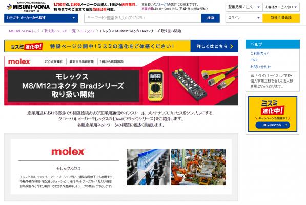 モレックスと共同でサービス展開を進めるミスミでは、Bradシリーズ約200アイテムを新たに在庫し、1個から送料無料で当日出荷致します。取扱製品の拡充に加え、ミスミではBrad製品に関する特設サイトを開設し、12月4日から公開します。また併せて同社通販サイトの登録会員へのメルマガ配信によってBradシリーズ取扱製品の特長や在庫についてご案内致します。