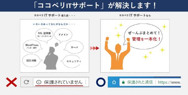 株式会社ココペリ(本社 : 東京都千代田区、代表取締役 : 近藤繁)は、士業の事務所向けサービスとして2017年11月1日より提供していたGoogleからのセキュリティ告知対応(常時SSL化)の「ココペリITサポート」を中小企業・個人事業主にも拡げて2017年12月6日より正式リリースいたします。