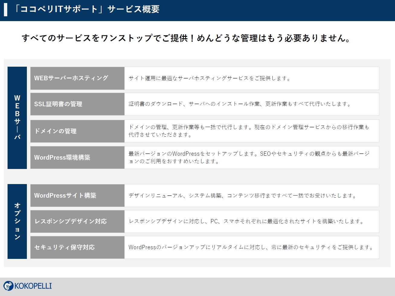 そこで、この課題を解決するためにホームページ運営を支援する新サービス「ココペリITサポート」を提供開始いたしました。