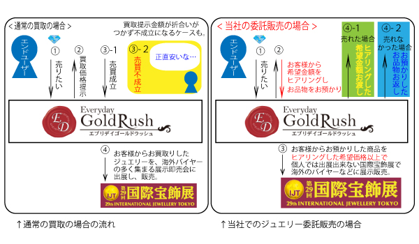 元々が高価な宝石やジュエリーにおいて、「不必要なジュエリーを処分したいが、買取だと正直安い」という声も少なくありません。そこで当社は、お客様(エンドユーザー)の売りたい金額を当社のバイヤーがヒアリングし、相談の上、委託での販売希望金額を決めて、個人では出展できない国際宝飾展で委託商品を販売し、海外のバイヤーなどへ売れた場合、その希望金額を全額お客様にお渡しするという新しいビジネスモデルを導入しました。(※委託の流れ 下記、右図参照)