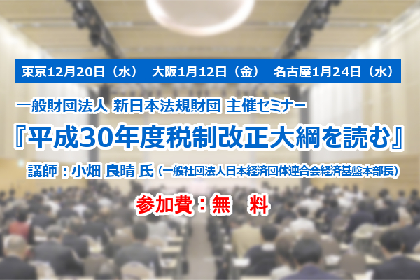 新日本法規出版株式会社(所在地:愛知県名古屋市中区栄1丁目23番20号、代表取締役:服部昭三 http://www.sn-hoki.co.jp/) は、一般財団法人 新日本法規財団主催セミナー『平成30年度税制改正大綱を読む』(参加費:無料)を12/20東京、1/12大阪、1/24名古屋で開催します。