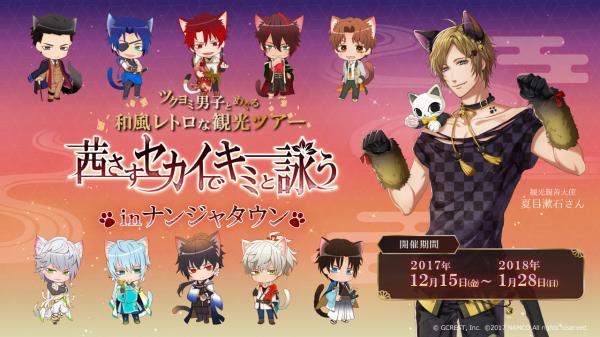 ナンジャタウンの代表ナジャヴ・ナンジャから観光親善大使のオファーを受けた夏目漱石が、日ノ許からツクヨミ男子たちと『猫の国・ナンジャタウン』を訪れるというコンセプトをもとに、ナンジャタウン限定の等身描き下ろしの夏目漱石と、ねこ耳をつけたちびキャラのツクヨミ男子10人が、お食事や甘味、ゲーム屋台の景品やオリジナルグッズなどになって登場します。また、園内の「七福猫」をめぐるラリーでは、ゲームの世界観に浸りながら、ツクヨミ男子と季節のデートをしている気分でイベントをお楽しみいただけます。