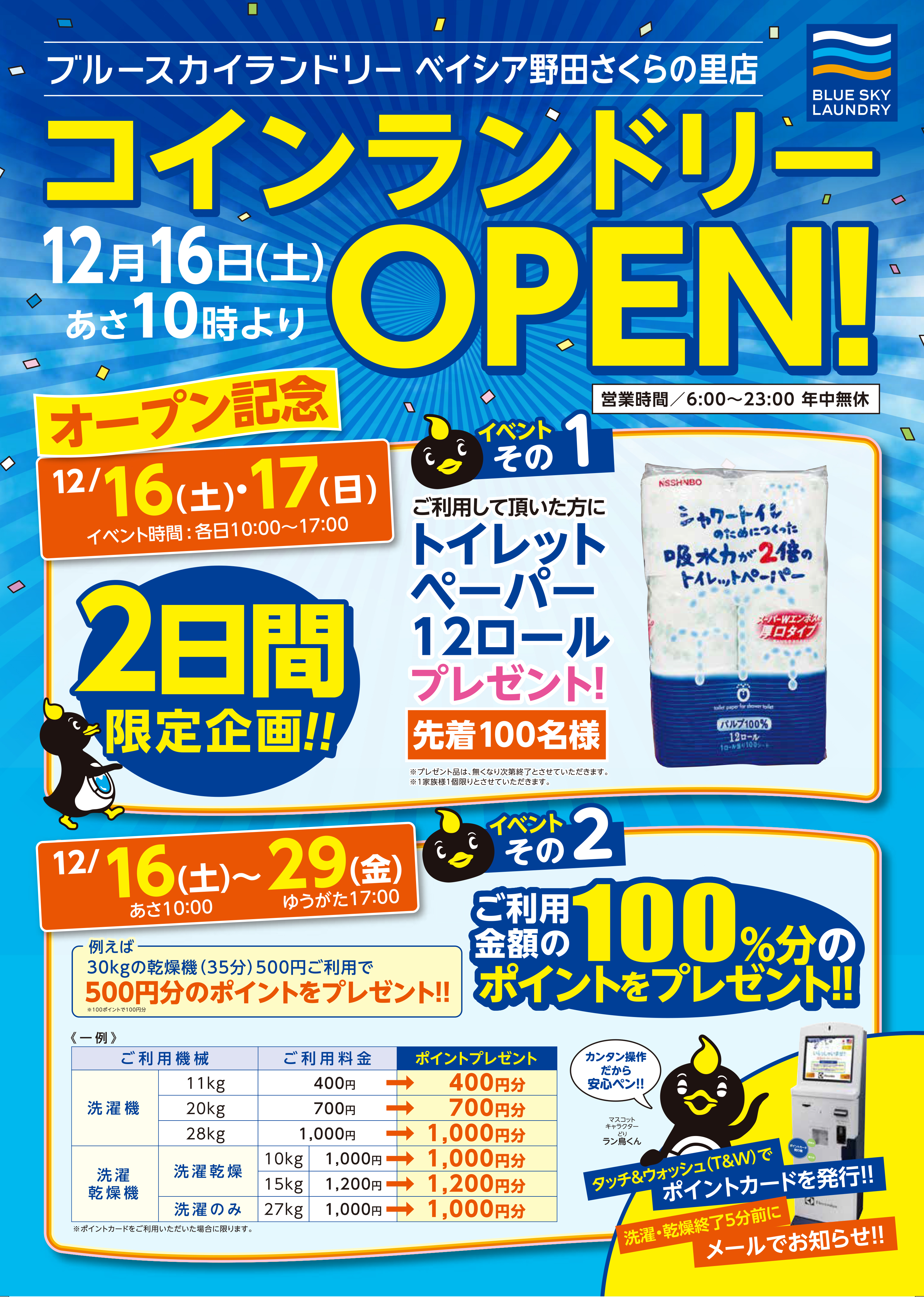 私たちブルースカイランドリーは、「ショッピングDEコインランドリー」をコンセプトに大手商業施設敷地内にコインランドリーを集中出店しております。この度2017年12月16日(土)より千葉県野田市のベイシア野田さくらの里店駐車場敷地内に千葉県第2号店、ベイシア第2号店となるブルースカイランドリーベイシア野田さくらの里店をオープンします。ブルースカイランドリーの特徴は午前中の3時間パートが常駐しており店内の掃除やお客様への接客を行い利用者の皆様に綺麗で快適な店舗をご提供しております。