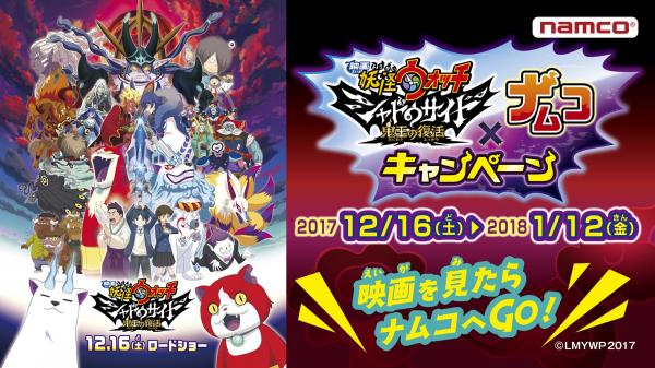 全国で約220店舗のアミューズメント施設を運営する株式会社ナムコは、話題の 『映画 妖怪ウォッチ シャドウサイド 鬼王の復活』の公開(2017年12月16日)を記念したキャンペーンを、上映館に隣接するナムコ直営アミューズメント施設(全国59ヶ所)で2017年12月16日(土)~2018年1月12日(金)の日程で実施します。