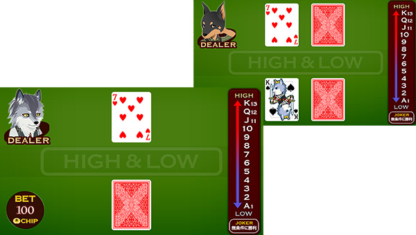 ディーラーの2枚のカードの合計より、自分のカードの合計がHIGH(高い)かLOW(低い)か、予想して選びます。