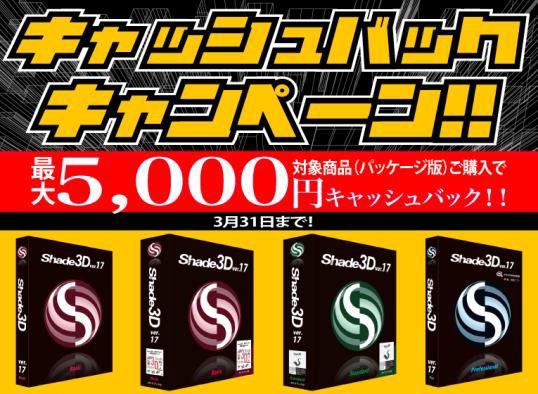 「Shade3D ver.17 パッケージ版」各グレードを購入いただいた方に、もれなく最大5,000円をキャッシュバック!