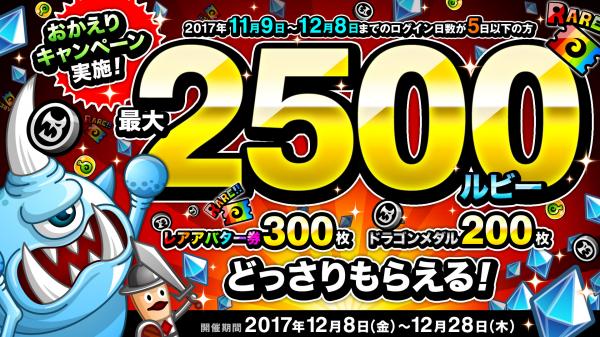12月8日(金)より、対象者には最大2500ルビーやドラゴンメダル200枚などがもらえる「おかえりキャンペーン」と、それ以外のユーザーには、最大1000ルビーやドラゴンメダル50枚などがもらえる「年末大感謝キャンペーン」を開催いたします。さらに、期間中に対象者のログイン人数が一定数を超えると、ユーザー全員へさらにルビーやドラゴンメダルがプレゼントされる、「おかえり全員ボーナス」も開催されます。皆でログインしてプレゼントをゲットしましょう!