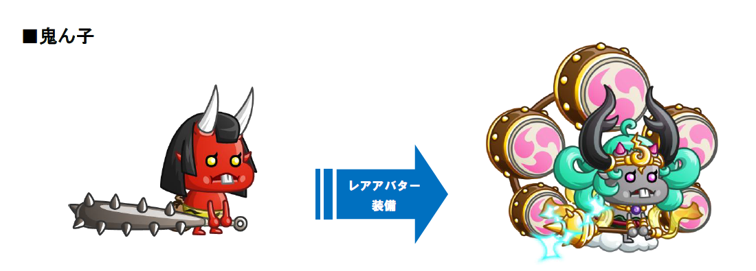 レアアバターは、「レアアバター券」を100枚集めると、研究所で交換することができる特殊な武具です。12月8日(金)メンテナンス後より、新たに「鬼ん子」のレアアバターを追加いたします。レアアバターを手に入れてキャラの能力をアップさせつつ、お着替えを楽しみましょう!