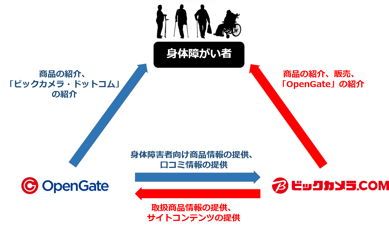 株式会社アクティベートラボ(本社:東京都中野区、代表取締役社長:増本 裕司、以下、アクティベートラボ)と、株式会社ビックカメラ(本社:東京都豊島区、代表取締役社長:宮嶋 宏幸、以下、ビックカメラ)は連携し、アクティベートラボが運営する身体障がい者同士がつながるSNS「OpenGate」、およびビックカメラが運営するインターネットショッピングサイト「ビックカメラ・ドットコム」の両サイトにて、身体障がい者にとって便利な商品を紹介、販売するサービスを、平成29年12月11日(月)より開始いたします。