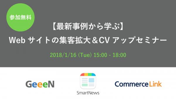 ECサイトの集客・売上拡大を支援するコマースリンク株式会社(本社:東京都大田区、代表取締役社長:藤田 由希子)は、スマートニュース株式会社(本社:東京都渋谷区、代表取締役:鈴木 健・浜本 階生)、株式会社GeeeN(本社:東京都渋谷区、代表取締役社長:橋本 剛)と共催で『【最新事例から学ぶ】Webサイトの集客拡大&CVアップセミナー ~効果のある広告活用術とサイト改善手法~』と題した無料セミナーを2018年1月16日(火)に開催します。