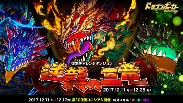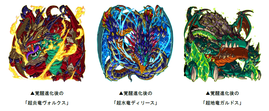 12月11日(月)より、チャレンジダンジョン「逆襲の三竜」を復刻開催いたします。本ダンジョンでは、覚醒した「超炎竜ヴォルクス」「超水竜ディリース」「超地竜ガルドス」のうち1体が日替わりで登場します。ダンジョンで覚醒進化素材を手に入れ、モンスターを覚醒させましょう!