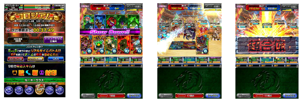 コロシアムのバトルは、5人vs 5人で1人1枚ずつカードを出して役勝負をします。より強い役を作ったチームが先攻となり、相手チームへ攻撃を行います。攻撃時に与えたダメージはBPとして加点され、5ターン終了後、合計BPが多いチームが勝利となります。