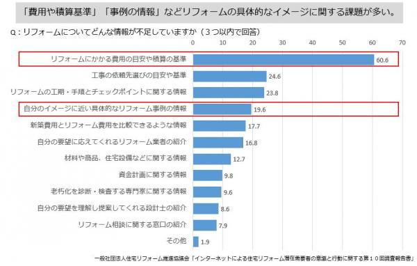 リフォーム時に不足している情報として「リフォームにかかる費用の目安や積算の基準」「自分のイメージに近い具合的なリフォーム事例の情報」といった『いくら出せば、どんなリフォームができるのか』という相場と事例に関する情報が不足しているという課題があります。