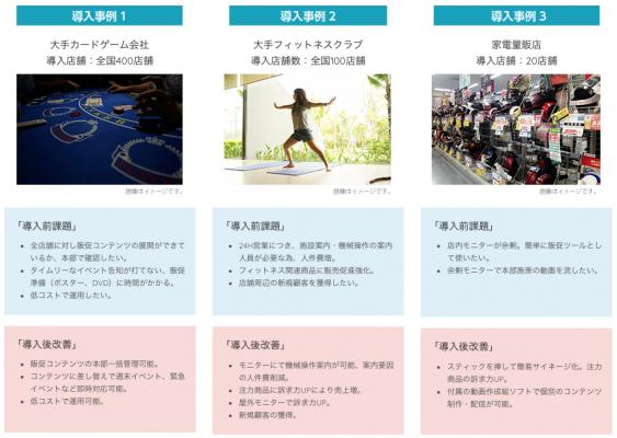 「導入前課題」全店舗に対し販促コンテンツの展開ができているか、本部で確認したい。タイムリーなイベント告知が打てない、販促準備(ポスター、DVD)に時間がかかる。低コストで運用したい。