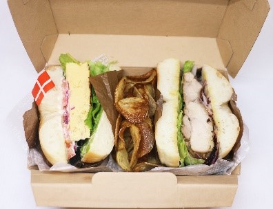 コンセプト :WEGOファンの方に向けて、フォトジェニックかつ、食べごたえのあるメニューにしたいと思い、ベーグルサンドであえて断面を見せるようにランチボックスに盛り付けました。スパイシーなジャークチキンと、イタリアンオムレツのベーグルサンド2種類に、自家製ポテトチップスを添えました。