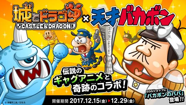 2017年12月15日(金)メンテナンス後より、伝説のギャグアニメ『天才バカボン』とのコラボイベントを開催いたします。コラボ期間中でしか手に入らない限定キャラとして「バカボンのパパ」もEGG ショップに登場!「バカボンのパパ」は研究開発をすることで、「バカ田大学の制服」や「ハジメちゃんの仮装」などさまざまな衣装にお着替えが可能です。さらに、「バカボンのパパ」が城に攻めてくるコラボ襲来イベントやコラボSP討伐イベント、豪華報酬が毎日もらえるログインキャンペーンなどを同時開催いたします。期間限定のコラボをどうぞお楽しみください!